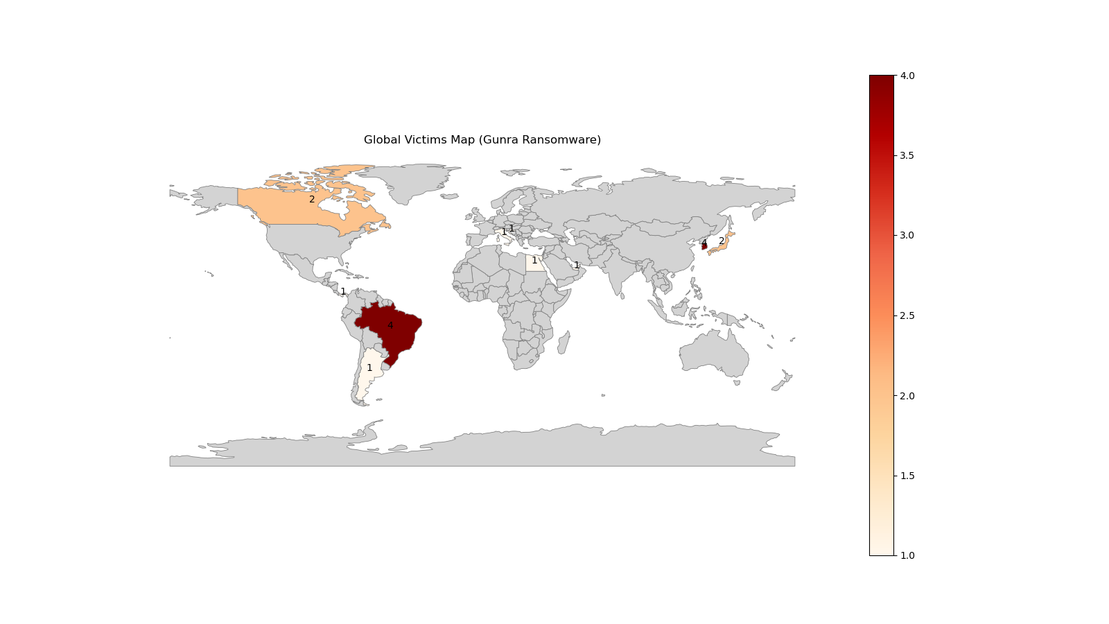 The following map illustrates the worldwide distribution of victims targeted by Gunra Group affiliates. This visual highlights the primary regions of focus and the broad international impact of the RaaS operation.