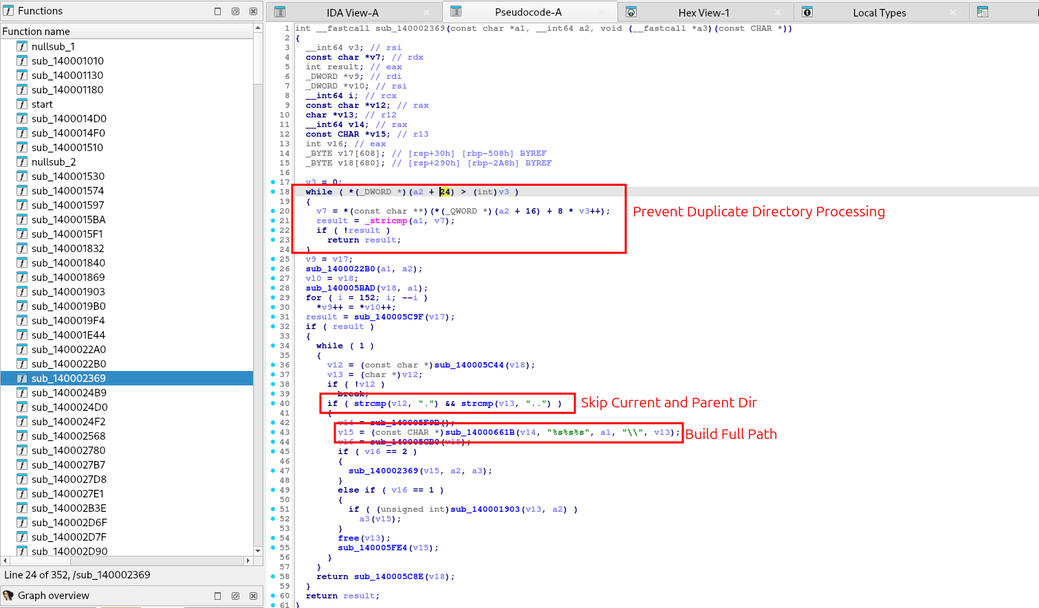 Once configured, the ransomware initiates its file-hunting process using the ##0x140002369## function, a recursive directory walker. This function systematically scans the victim's storage, starting from drive A and proceeding through Z, attempting to access each drive and traverse its directory tree.
