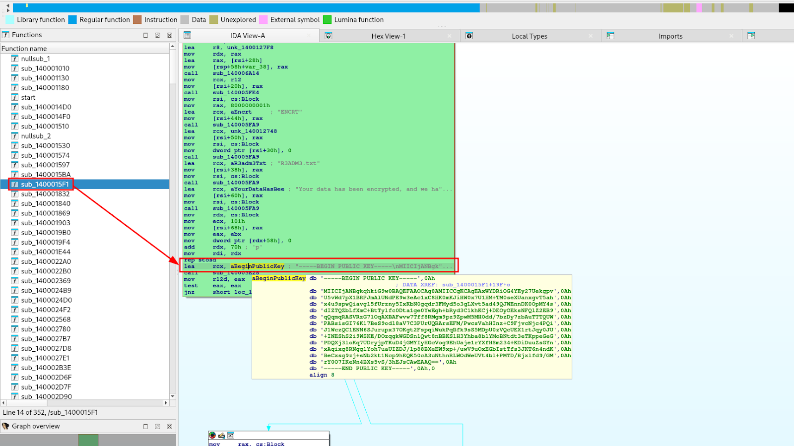 Upon execution, the ransomware binary is loaded by the Windows loader, and control transfers to the start function (0x1400014b0). This function first establishes the runtime environment before calling the main configuration routine at 0x1400015F1, where the malware prepares for its attack.