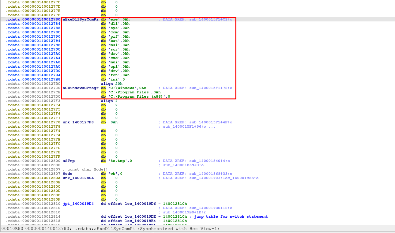 Exclusion Strategy: The algorithm first extracts the file extension using strrchr to locate the last dot. It then performs a case-insensitive comparison against an exclusion list (located at 0x140012780). This list specifically contains fourteen system-critical file extensions: