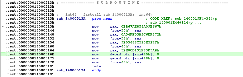 To make sure no two files are the same (and to make recovery a total nightmare), the ransomware cooks up new crypto stuff for every single file using standard Windows BCrypt APIs. Specifically, ##sub\\_140005320## calls BCryptGenRandom (##0x1400070F0##) to create a unique 32-byte (256-bit) ChaCha20 key and a 12-byte (96-bit) nonce for each file.