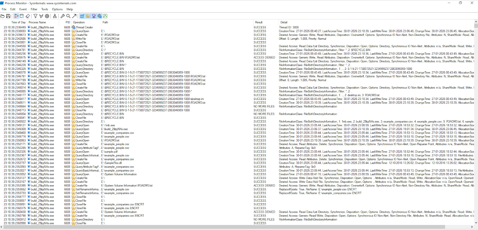 Immediately after execution, the ransomware spawned worker threads and began high-volume filesystem enumeration. ProcMon logs show rapid sequential access across multiple drive letters, confirming the recursive drive scanning routine described in the static execution flow.