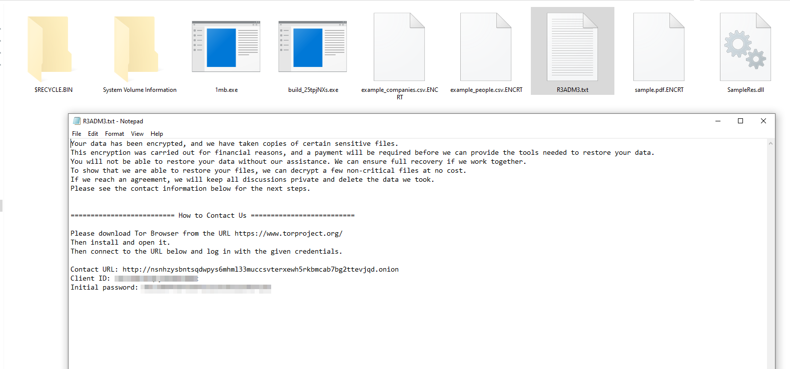 After encryption completes within a directory, the ransomware writes a ransom note named R3ADM3.txt. ProcMon captures a deterministic pattern: