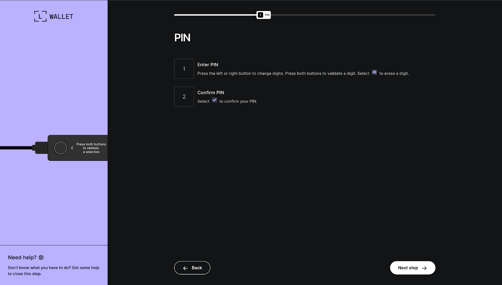 A progress bar marks this as step "2 PIN". The interface presents an interactive digit grid where users select numbers to "enter" and "confirm" their PIN, complete with instructions: "Press the left or right button to change digits. A visual mockup of the device with highlighted buttons appears alongside, closely replicating the real hardware experience. Once confirmed, a "Next step" button proceeds forward.