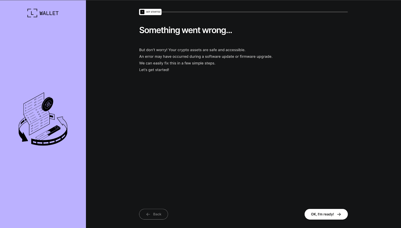 This screen features a calming headline reading "Something went wrong..." followed by reassuring text: "But don't worry! Your crypto assets are safe and accessible. An error may have occurred during a software update or firmware upgrade. We can easily fix this in a few simple steps. Let's get started!" An illustration of a hardware device with a looping arrow reinforces the idea of a temporary glitch. A prominent "OK, I'm ready!" button advances the user to the next stage, lowering defenses by emphasizing safety and simplicity.