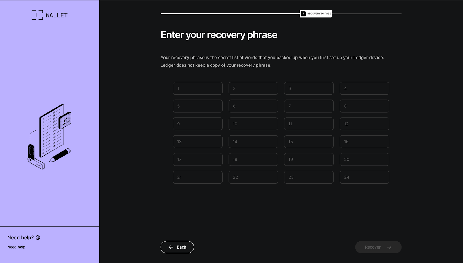 Marked as step "3 RECOVERY PHRASE" in the progress bar, this screen displays a clear prompt: "Enter your recovery phrase". Supporting text explains: "Your recovery phrase is the secret list of words that you backed up when you first set up your Ledger device. Ledger does not keep a copy of your recovery phrase." Twenty-four numbered input fields are arranged in a grid, allowing word-by-word entry. A "Recover" button submits the form once complete.