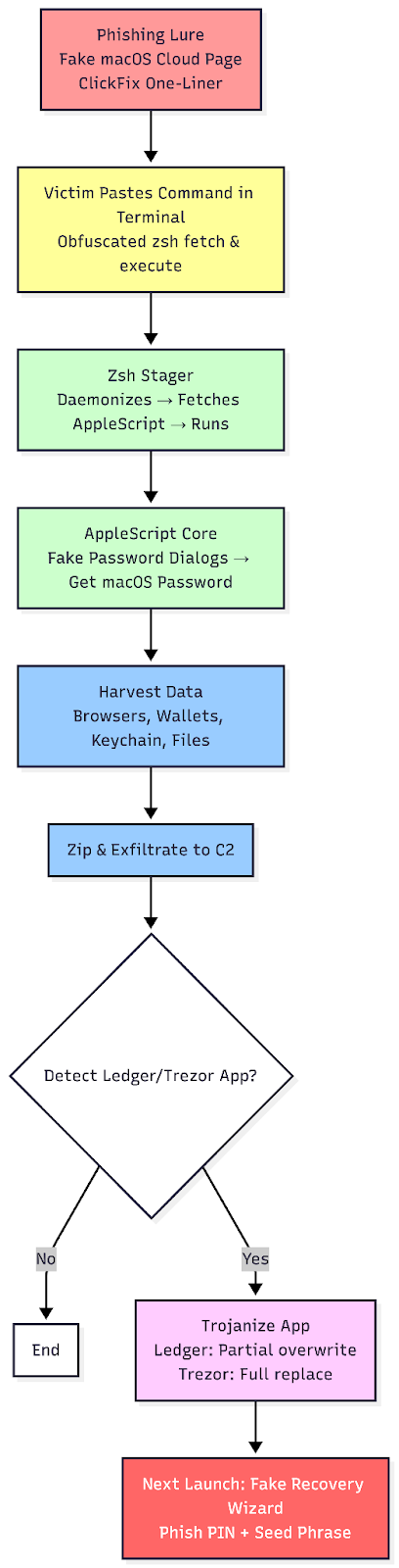 This report documents a complete technical reversal of the observed campaign variant. Analysis was performed through manual deobfuscation of the delivery payload, safe retrieval and dissection of the remote AppleScript core, controlled examination of exfiltration behavior, and detailed inspection of the trojanized Electron application bundles. Particular attention is given to the persistence mechanism, an area often glossed over or misunderstood in existing public reporting which exploits specific weaknesses in Electron-based cryptocurrency tools prevalent among macOS users. The goal is to provide defenders with a definitive reference on this threat, including actionable indicators and detection strategies that extend beyond surface-level observations.