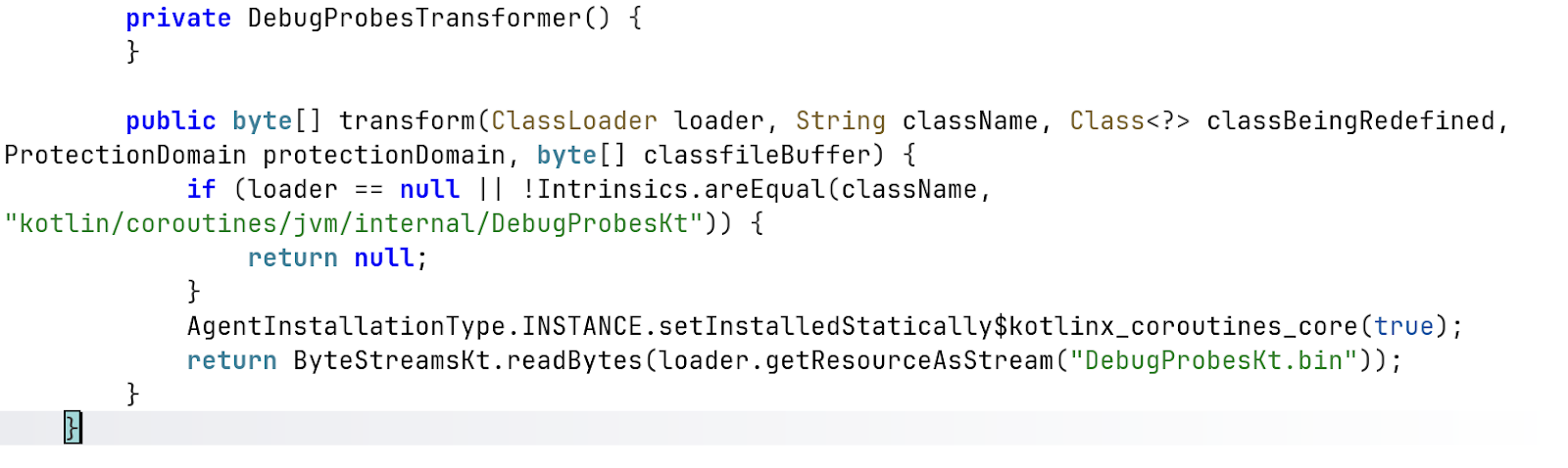 This mechanism appears to be related to Kotlin coroutine debugging instrumentation rather than direct malicious functionality. However, such runtime bytecode replacement techniques can complicate static analysis by altering class behavior at load time and hiding the effective runtime implementation from the original compiled code.