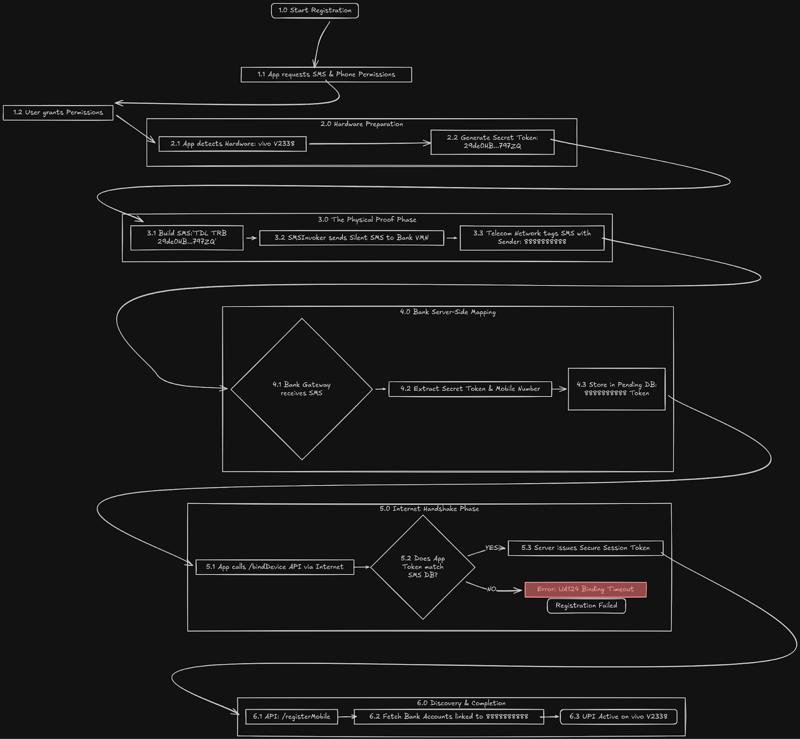 Binding Success: The attacker’s app calls the /bindDevice API. The Bank sees the token matches the "legitimate" SMS received in Phase 4 and binds the victim's bank account to the attacker's phone.
