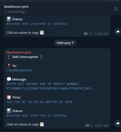 SIM-Binding Bypass (Outgoing): When the user triggers UPI registration, the payment app tries to send a background SMS. The module hooks sendTextMessage, captures the message content (which contains the encryption key for registration), blocks the actual SMS from reaching the cellular network, and sends the data to a Telegram bot. From the telegram bot it is sent by the threat actors from the victim’s device that has been compromised through social engineering or other means.
