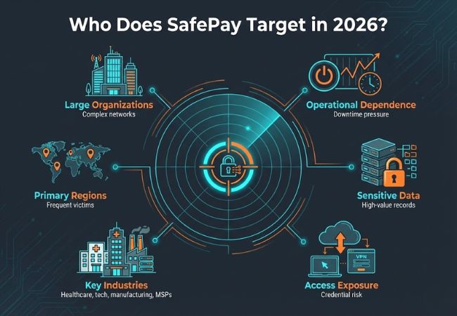 Victims are chosen based on the impact that interruptions or data exposure would create. Organizations that depend on remote access and interconnected systems face the greatest risk because SafePay aims for environments where pressure produces fast leverage.